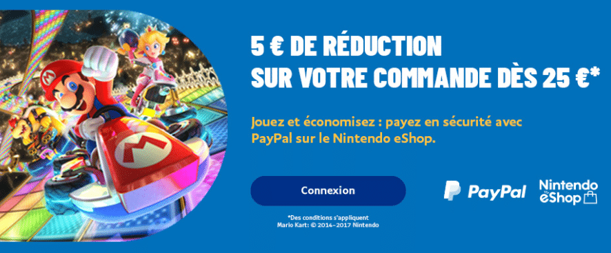 Une offre plutôt sympa si vous avez l’habitude d’acheter des jeux sur l’eShop de Nintendo : bénéficiez de 5€ de remise immédiate dès 25€ d’achats en payant par Paypal !