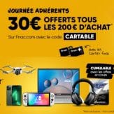 Pour cette fois, ce n’est pas un weekend adhérent pour ce bon plan, mais plutôt un vendredi adhérent ! Aujourd’hui donc, la Fnac offre 30€ de chèque cadeau tous les 200€ aux adhérents grâce au code « CARTABLE » !