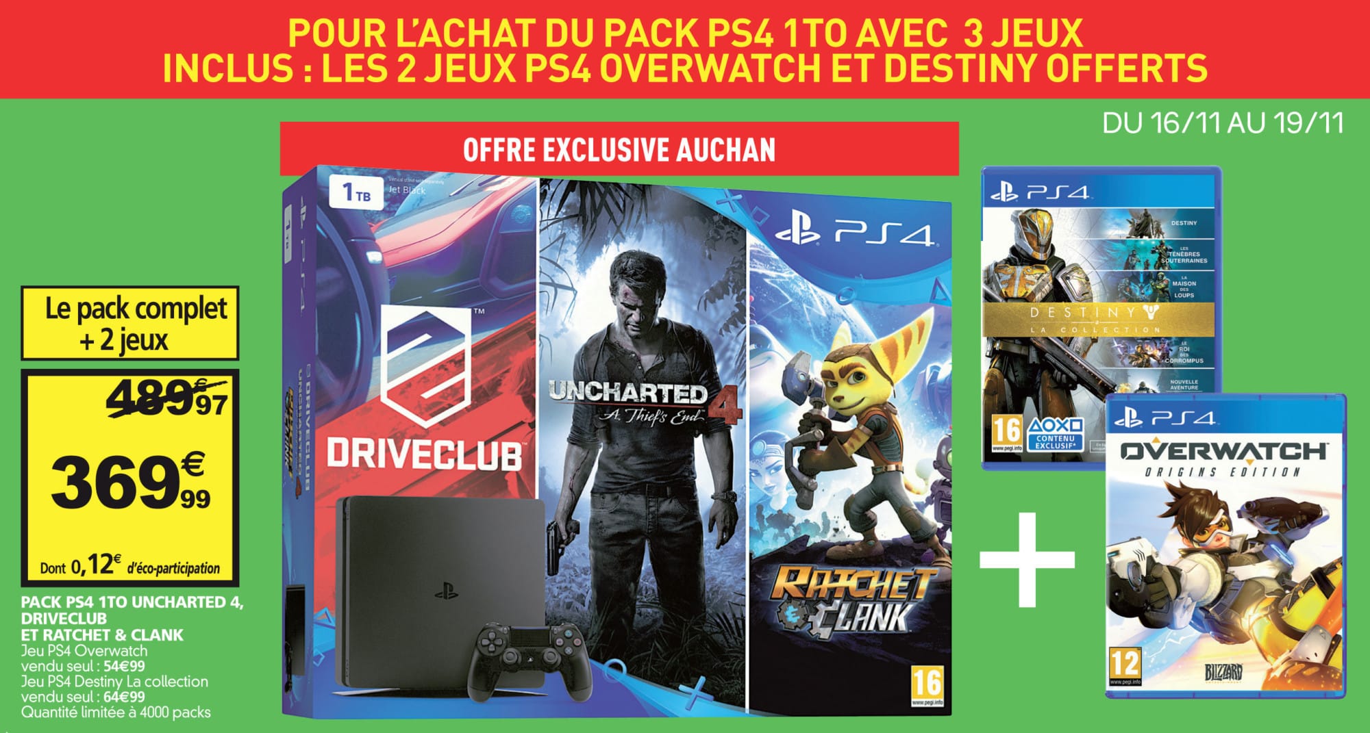 Bon plan plutôt fourni du côté de chez Auchan avec ce pack PS4 proposé à 359.99€ et contenant :