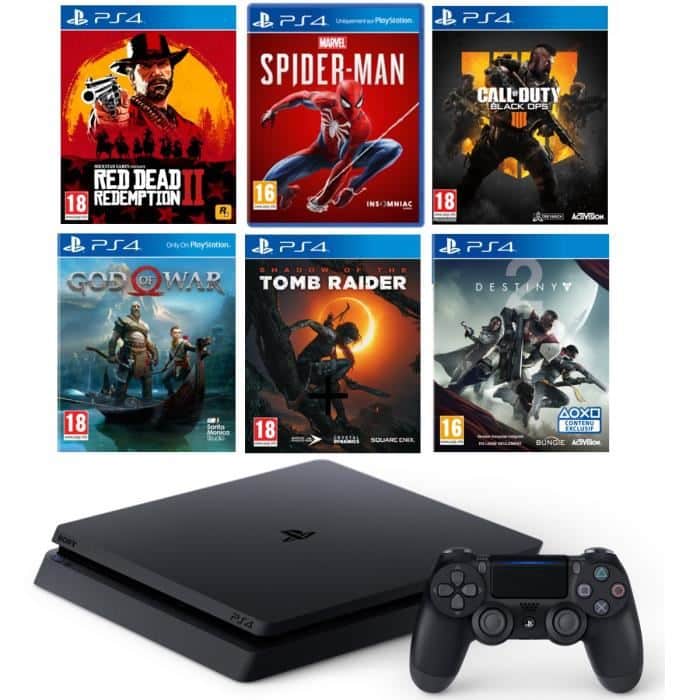 Console PS4 Slim 1To + Red Dead Redemption II + Spider-Man + Call of Duty Black Ops IIII + God of War + Shadow of the Tomb Raider + Destiny 2 à 399.99€
