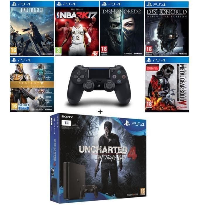 Console PS4 Slim 1To + Uncharted 4 + FF XV + Destiny Collection + NBA 2k17 + Dishonored 1&2 + MGS V Complete + 2ème manette à 359.99€