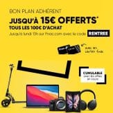 Nouveau weekend adhérent chez la Fnac ! Cette fois-ci, ce n’est pas 10€ qui sont offerts tous les 100€ d’achats, mais bel et bien 15€ par tranche de 100€ ! Pour en profiter, il suffit d’entrer le code « RENTREE » et vous recevrez les CC rapidement après votre commande. A noter qu’il faut être Fnac+ pour avoir les 15€, si vous êtes adhérent « normal », c’est 10€ qui vous seront offerts.