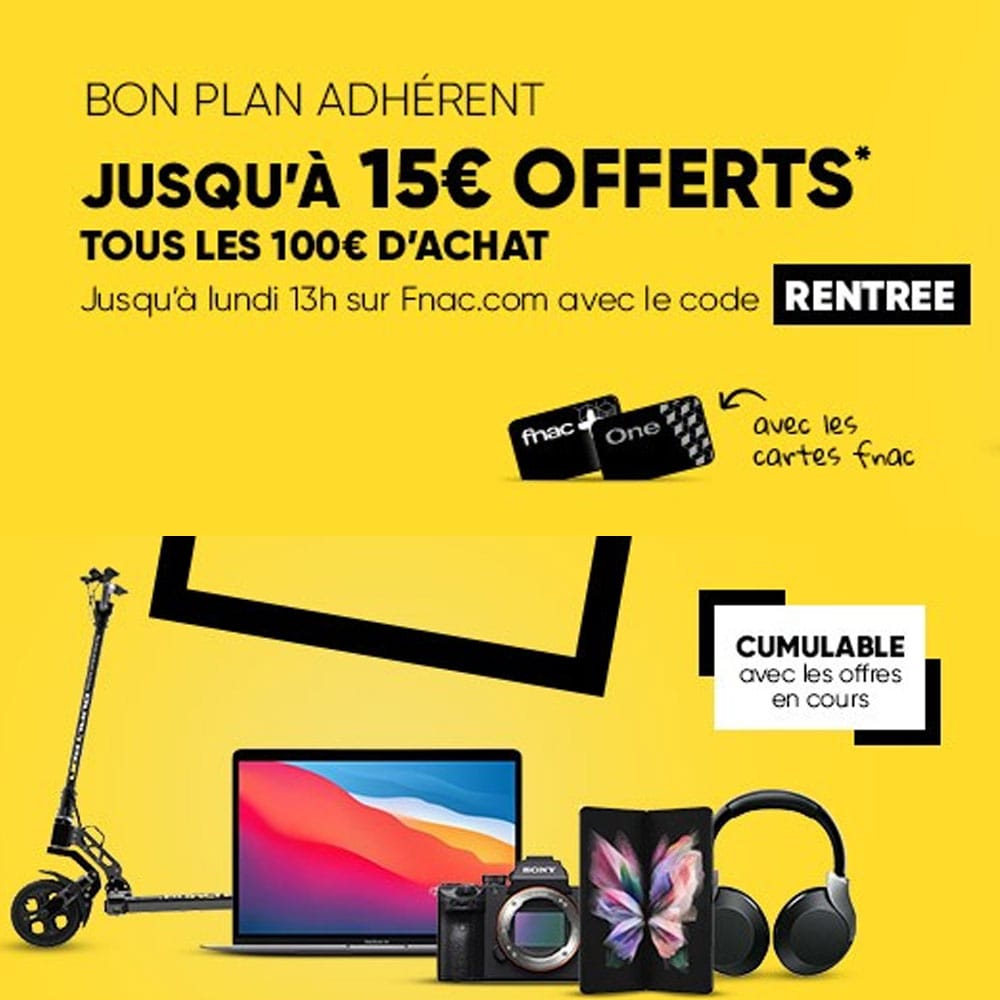 Descriptif : 15€ offerts tous les 100€ d’achat pour les adhérents carte One et Fnac+ et 10€ offerts tous les 100€ d’achat pour les adhérents carte Fnac, titulaires d’une carte en cours de validité. Offre valable dans la limite des stocks disponibles (hors MarketPlace), sur Fnac.com du Mercredi 25 Aout à 18h00 au Lundi 30 Aout à 13h00 avec le code promo RENTREE (à saisir en majuscule) et en magasin du Jeudi 26 Aout au Dimanche 29 Aout (pour les magasins ouverts) sur présentation du code-barre reçu par mail.