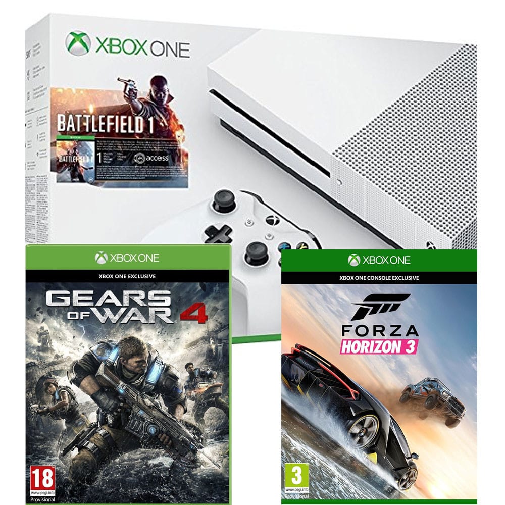 - Console Xbox One S + Battlefield 1 + Gears of War 4 + Forza Horizon 3 à 299.99€