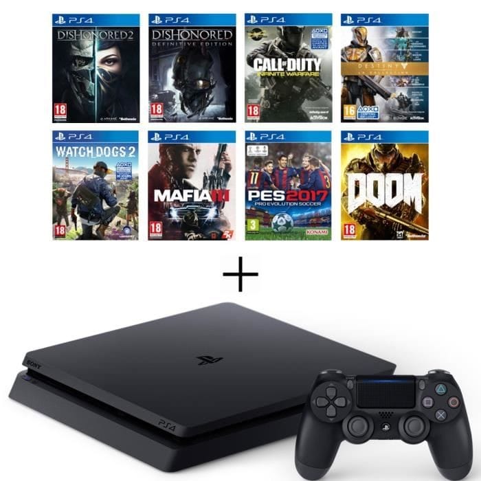 PS4 Slim + Dishonored 1 & 2 +COD IW + Destiny Collection + Mafia 3 + WatchDogs 2 + PES 17 + Doom à 399.99€
