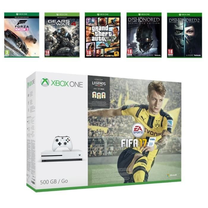 Pour exemple nous avons ce pack à 349.99€ contenant : la Xbox One S 500 Go et 6 jeux (FIFA 17, Forza Horizon 3, Gears 4, GTA 5; Dishonored 1 &2) : http://www.cdiscount.com/jeux-pc-video-console/consoles/xbox-one-s-500go-6-jeux-fifa-17-forza-horizo/f-1033917-bunx1fifa500bf.html