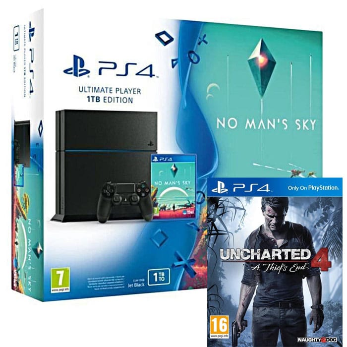 Bon plan intéressant si vous souhaitez vous achetez la console PS4 avec le jeu No Man’s Sky car actuellement le jeu Uncharted 4 est offert avec ! Mais ce n’est pas tout, d’autres packs sont disponibles :