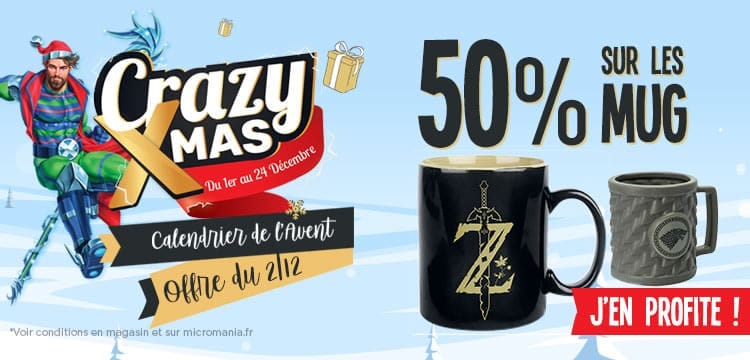 A l’occasion des fêtes de Noël qui approchent à grands pas, Micromania propose des promotions avec un calendrier de l’Avent. En ce deuxième jour de décembre, ce sont les mugs qui sont concernés, avec une remise de 50% sur tout le rayon !