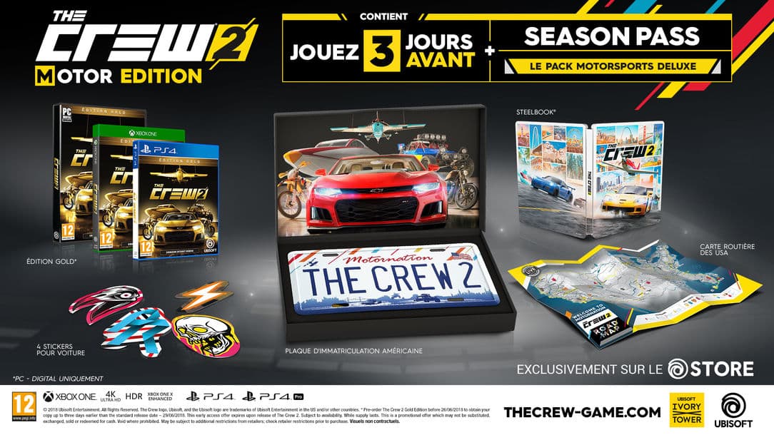 A noter que l’édition Gold de The Crew 2 inclut le season pass du jeu, vous aurez donc droit à toutes les extensions à venir (et il y en aura plus d’une ^^). De plus, le pack digital Motorsports Deluxe est offert, soit pas mal de bonus au final.
