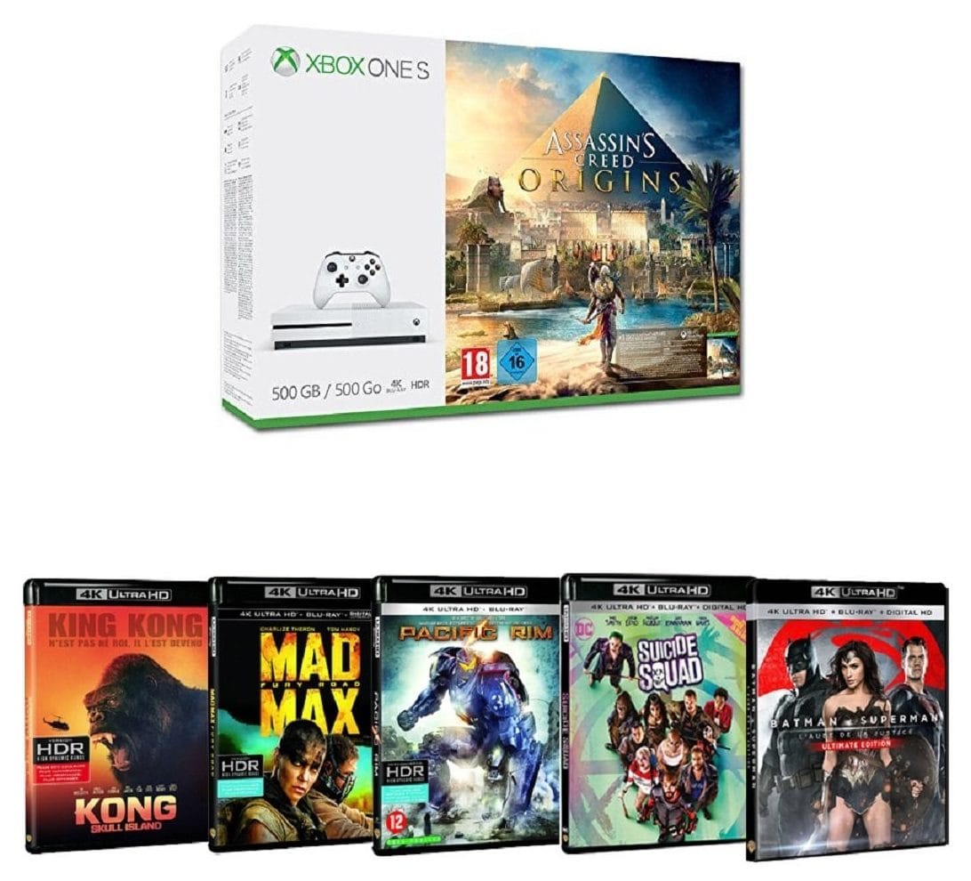 Xbox One S + Assassin’s Creed Origins + 5 Blu-ray 4K à 299.99€ (ou 1To à 309.99€)